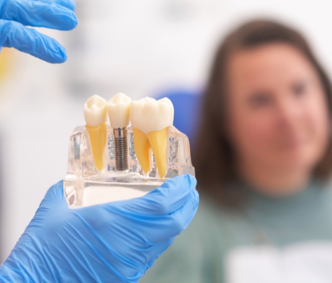 Dental implants are artificial tooth roots that support a crown, bridge or dentures. They are recommended for secure, long-term single-tooth replacement, as well as for more extensive rows of teeth.